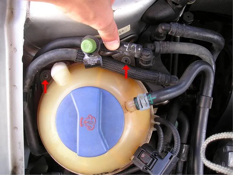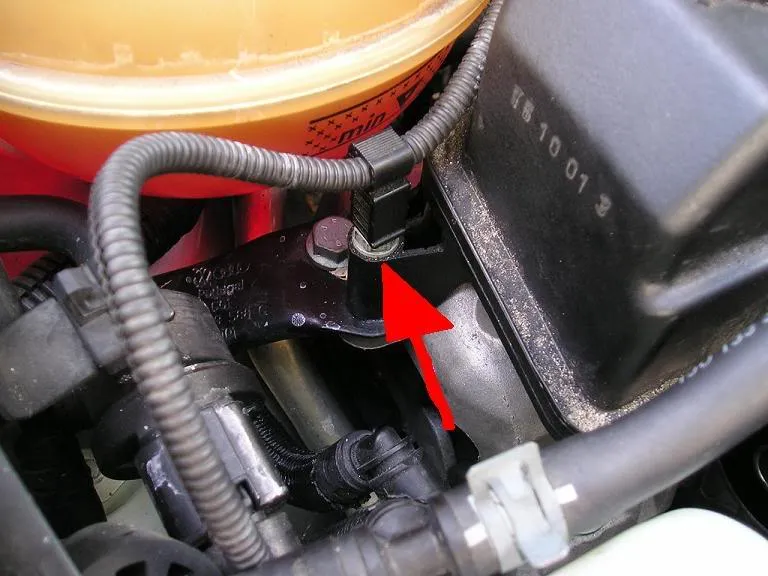 Retirez les deux vis qui maintiennent le réservoir de liquide de refroidissement ainsi que le boulon qui maintient le réservoir de direction assistée (une douille de 10 mm est nécessaire).