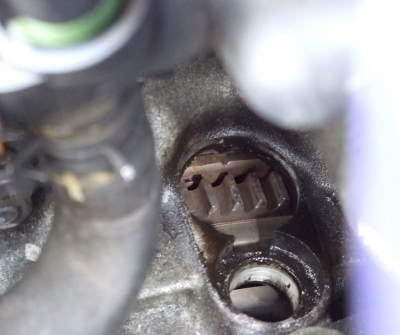 Si vous avez une transmission automatique, il n'y a pas de repère de calage sur le volant moteur. Transmission manuelle uniquement. Si c'est une transmission manuelle, il y a un bouchon en caoutchouc noir sur le dessus, à l'endroit où le carter d'embrayage rejoint le bloc moteur. Retirez ce bouchon et vous verrez les dents de la couronne de démarreur. Utilisez une lampe de poche : il y a un petit triangle au-dessus de la couronne. Ce triangle correspond à un petit triangle entaillé dans la couronne, juste en dessous des dents. Lorsque ces deux repères sont alignés, le cylindre n° 1 est au PMH, et les repères de calage de la poulie de courroie d'entraînement et du carter de courroie trapézoïdale sont également alignés (autre extrémité du vilebrequin, avant du moteur). J'ai l'impression que le repère du volant moteur est un peu plus précis, car sa circonférence est beaucoup plus grande.