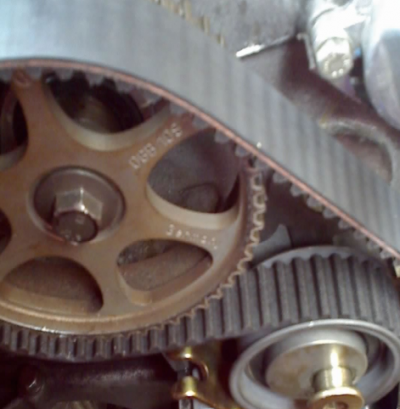 - Remettez la courroie, resserrez-la et repartez… MDR ! Vous constaterez, comme d'autres l'ont signalé, que la nouvelle courroie semble un peu courte (rappelez-vous le commentaire ci-dessus concernant l'étirement de la courroie). Voici pourquoi vous avez marqué la nouvelle courroie : cela garantit que le rapport came-vilebrequin ne soit pas modifié (croyez-moi, comme beaucoup sur ce forum l'ont appris, modifier ce rapport coûte cher). Commencez par l'arbre à cames, descendez jusqu'à la pompe à eau, puis au vilebrequin. Vous constaterez peut-être que le pignon de vilebrequin doit se déplacer d'une demi-dent ou moins (pas d'inquiétude). Conservez simplement les repères que vous avez faits sur la nouvelle courroie au bon endroit sur chaque pignon.
