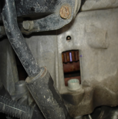 Voici la partie inférieure (transmission). Celle-ci est un peu plus difficile à repérer ; il vous faudra donc la placer sur le dessus de la transmission et trouver un bouchon noir. Retirez-le pour exposer le trou marqué.