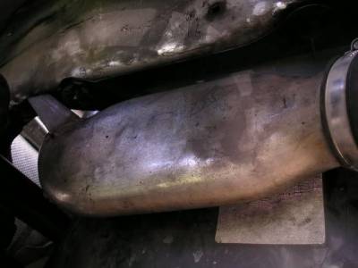 Retirez le tube de charge inférieur (tube pancake) à l'aide d'un tournevis plat ou d'une douille de 7 mm pour desserrer les colliers et d'une douille de 10 mm pour retirer l'écrou qui maintient le support. Je vous conseille de retirer le collier de l'échangeur et de retirer la connexion en silicone du circuit intégré avec le tube. C'est beaucoup plus facile que de retirer le collier du tube et d'essayer de retirer le tube.