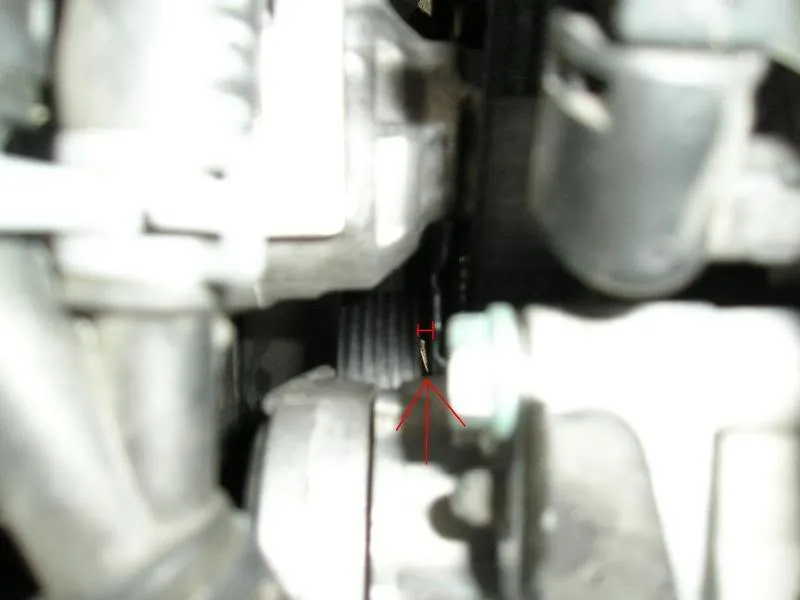 Lorsque je l'ai fait, il me manquait littéralement une demi-dent sur la poulie de vilebrequin. J'ai simplement déplacé légèrement le vilebrequin dans le sens inverse des aiguilles d'une montre afin de pouvoir serrer la courroie de distribution au point marqué. Ne vous inquiétez pas, cela n'aura aucun effet sur la poulie de distribution, car la courroie du côté droit est légèrement détendue. Lorsque vous replacez la courroie, remettez la poulie de vilebrequin au PMH en la déplaçant dans le sens des aiguilles d'une montre de la même distance que dans le sens inverse. Vous pouvez vérifier cela de l'autre côté du moteur, là où se trouvait le bouchon en caoutchouc.
