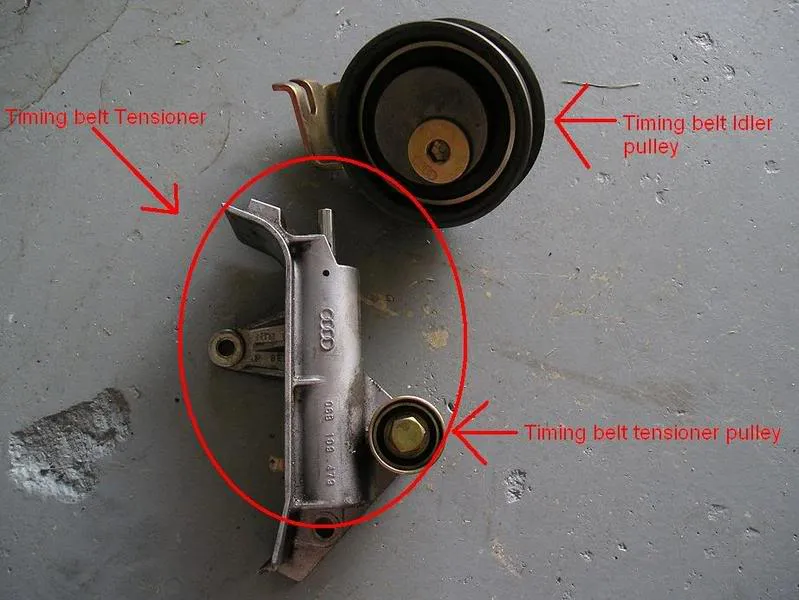 - Avec le support démonté, la vie est belle, la courroie est directement accessible. Faut-il la marquer à la peinture ? Non, mais je vais vous expliquer pourquoi c'est utile pour ceux qui ne gagnent pas leur vie en réparant des courroies de distribution VW/Audi. Le pignon (le vilebrequin) va bouger, c'est bien de savoir que le rapport vilebrequin-came est parfait. Donc, commencez par faire tourner le moteur jusqu'au PMH (alignez le repère du volant moteur et le pignon d'arbre à cames avec le couvercle de cames). Sur ma transmission intégrale, lorsque le vilebrequin était aligné avec le volant moteur, le repère de came était parfaitement aligné avec celui du couvercle, à un cran près. Est-ce nécessaire ? Pas vraiment, est-ce une bonne pratique pour le bricoleur ? Pourquoi prendre le risque ? Vous êtes là pour 10 heures, et encore quelques minutes ? Ensuite, marquez l'arbre à cames/courroie (j'ai fait deux dents espacées de plusieurs dents pour encadrer le repère sur la poulie), puis marquez la poulie/courroie de vilebrequin. - Retirez le petit galet tendeur ou retirez tout le galet tendeur. Notez que l'ancienne courroie est détendue. Sur ma transmission intégrale, le piston hydraulique était d'environ l'épaisseur d'un majeur (une main plutôt petite) (doigt entre le corps du galet tendeur et le support de galet tendeur). Retirez la courroie, marquez soigneusement la nouvelle courroie après avoir soigneusement compté ses dents ; répétez l'opération trois fois si vous l'enroulez autour de l'essieu, comme moi et ma clé anglaise. N'oubliez pas que vous jouez avec le calage du moteur ; il doit donc être correct, sinon…