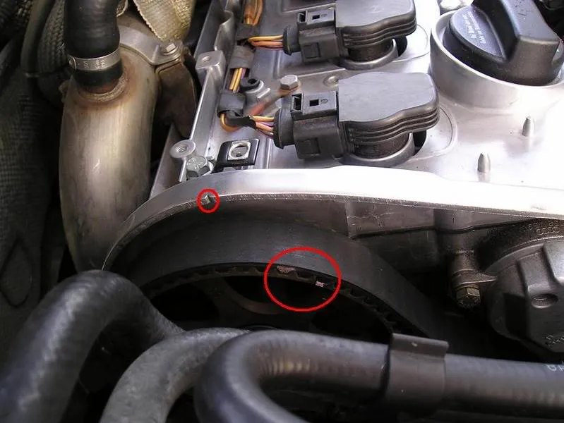 5 : Pour le marquage de la courroie de distribution et des poulies, utilisez une couleur qui contraste avec le moteur. À défaut de blanc correcteur, nous avons utilisé de la peinture argent pour maquette. C'était vraiment stupide. La première fois que j'ai monté le tendeur et que j'ai tout vérifié, il s'est avéré que la courroie avait glissé de deux dents pendant que je me débattais avec le tendeur, et ce n'était pas immédiatement visible, sauf en y regardant de plus près. Si on avait utilisé de la peinture orange vif, ça aurait été plus évident.