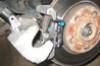 2. Démonter le support d'étrier avec la clé de 18. Notez que j'ai suspendu l'étrier au ressort d'amortisseur pour qu'il ne pende pas au bout du flexible de frein.
